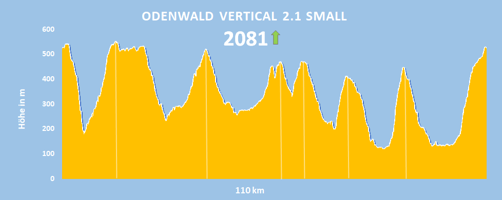Die Einsteiger Runde der "Odenwald Vertical Serie`. Eine schöne Runde durch den badischen und hessischen Odenwald, die sich durch viele versteckte Odenwald Täler mit langgezogenen Anstiegen und Abfahrten auszeichnet. Auch wenn das ein oder andere Flachstück für ein wenig Entlastung sorgt, sind die 2000 HM auf guten 100km kein Zuckerschlecken. Auf Grund der Länge nur für erprobte Bergziegen zu empfehlen.