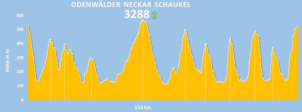 Das gesamte Odenwälder Neckartal in einem Guss mit in Summe 6 Brücken Überquerungen. Die engmaschig gesetzten Anstiege sorgen für prachtvolle Aus- und Weitblicke in Kombination mit rasanten Abfahrten. Ganz sicher eine sehr reizvolle Erfahrung für erfahrene Bergziegen, die sich auch in ständiger Flussnähe wohlfühlen.