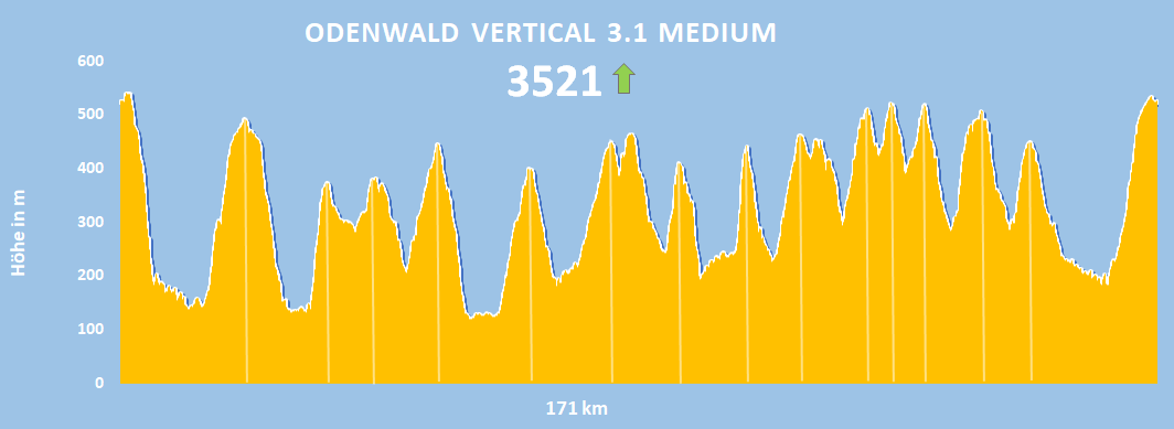 Der wohl "Kleine Bruder" der Königstour "Odenwald Vertical 5.2 all in", wobei "Klein" hier mit Vorsicht zu genießen ist. Ein etwas reduziertes Gesamtpaket mitten durch den hessischen und badischen Odenwald. Die engmaschige Verkettung von zahlreichen Klassikern in einer großen Runde in Kombination mit kurvenreichen und einsamen Straßen in einer eindrucksvollen Naturlandschaft prägen den Charakter der Tour. Nur wirklich erprobte Bergziegen dürfen sich auf gestreckte 170km mit 3.500 HM freuen.